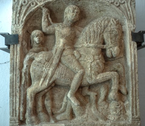 - Giebel mit Rosette, auf den Ecken liegende Löwen. In Bogennische zwischen kannelierten Pilastern Reiter (Soldat) nach rechts über einen gefallenen Feind reitend. Waffen: Speer, Schwert. Hinter dem Pferd stehender Calo. Gerahmtes Schriftfeld.