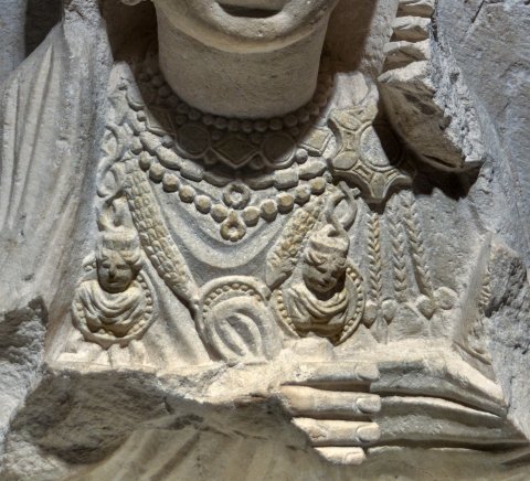 - Rahmenlose Platte mit Hochrelief. Büste einer Frau mit ornamentiertem Stirnband, Haube und Schleier, Ohrschmuck, Halsketten, Scheibenfibel mit Anhängern, von den Schultern herabhängende Ketten mit daran hängenden Medaillons mit bekleideten weiblichen Büsten. Inschrift neben der linken Kopfseite.