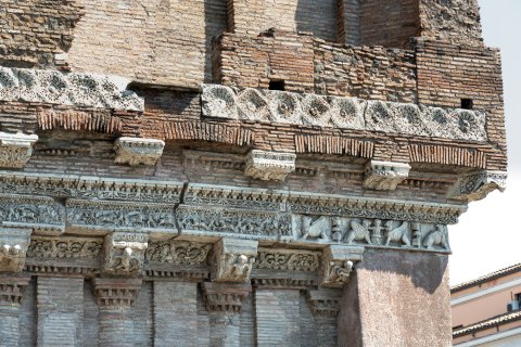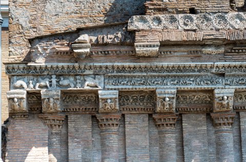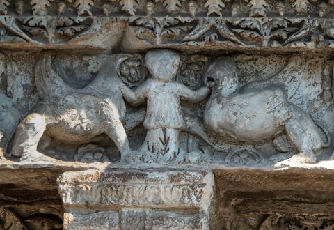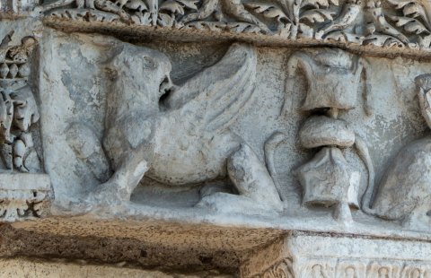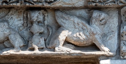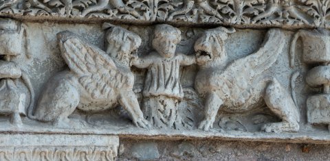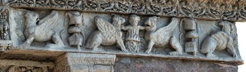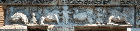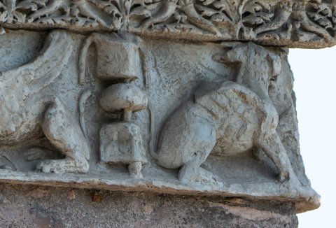 - Auf beiden Fragmenten in der Mitte je eine Rankenfrau zwischen hockenden Greifen, hinter diesen jeweils ein Kandelaber und ein weiterer Greif.