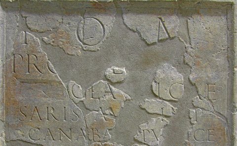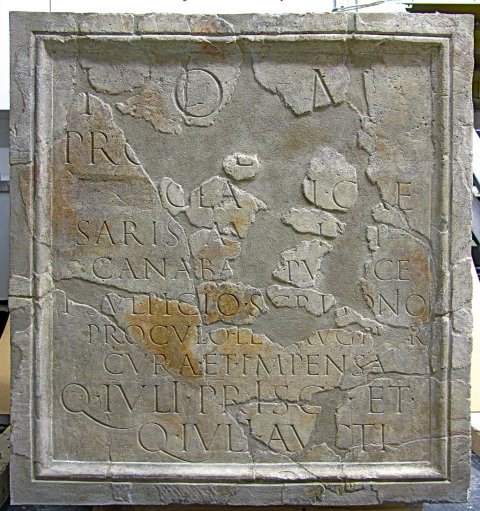 - I(ovi) O(ptimo) M(aximo) / pro [sa]l[ute] [[Nero]]/[[nis]] Clau[d]i Cae/saris Au[g(usti)] Imp(eratoris) / canaba[rii] pub[li]ce / P(ublio) Sulpicio Scribonio / Proculo leg(ato) Aug(usti) pr(o) [p]r(aetore) / cura et impensa / Q(uinti) Iuli Prisci et / Q(uinti) Iuli Aucti