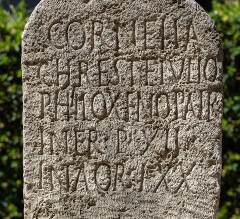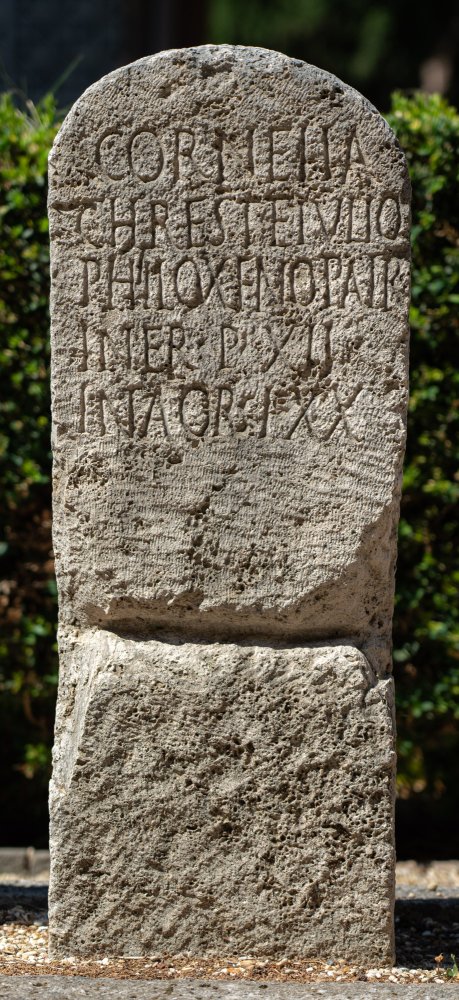 - Cornelia / Chreste Iulio / Philoxeno patr(i) / in fr(onte) p(edes) XII / in agr(o) p(edes) XX