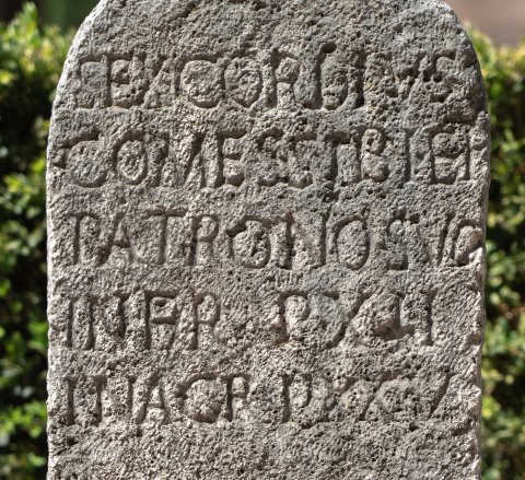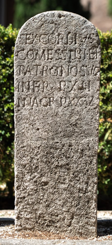 - Sex(tus) Cordius / Comes sibi et / patrono suo / in fr(onte) p(edes) XII / in agr(o) p(edes) XXV