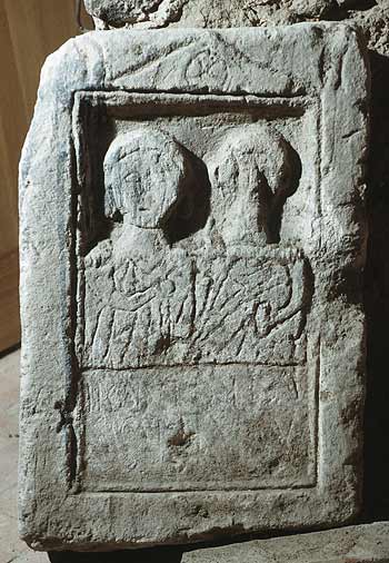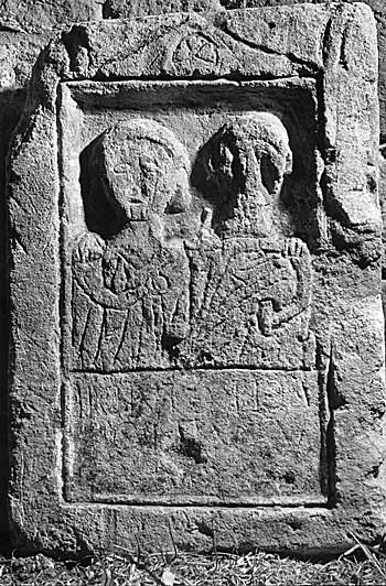 Im Hauptbild in Rechtecknische zwei Brustbilder (Ehepaar). Links Frau: hinter den Ohren aufgerolltes Haar, in der Linken Frucht. Rechts Mann: Zwiebelknopffibel, in der Linken Rolle (volumen). - Inschrift