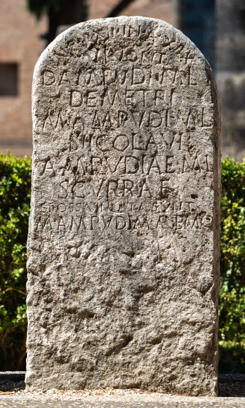 - In f(ronte) p(edes) XII in a(gro) (pedes) XIIX / vivont / D(ecimi) Ampudi M(arci) l(iberti) / Demetri / M(arci) Ampudi M(arci) l(iberti) / Nicolavi / Ampudiae M(arci) l(ibertae) / Scurrae / et ossa inlata sunt / M(arci) Ampudi M(arci) l(iberti) Artemo(nis)