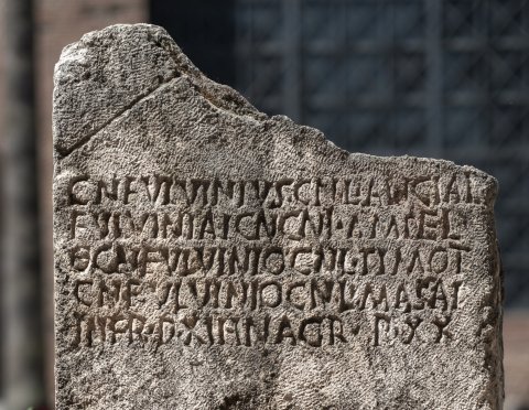 - Cn(aeus) Fulvinius Cn(aei) l(ibertus) Ancial(us) / Fulviniai(!) CnCn(aeorum) l(ibertae) Ampel(idi) / |(obito) Cn(aeo) Fulvinio Cn(aei) l(iberto) Timot(heo) / Cn(aeo) Fulvinio Cn(aei) l(iberto) Masai / in f(ronte) p(edes) XII in agr(o) p(edes) XX