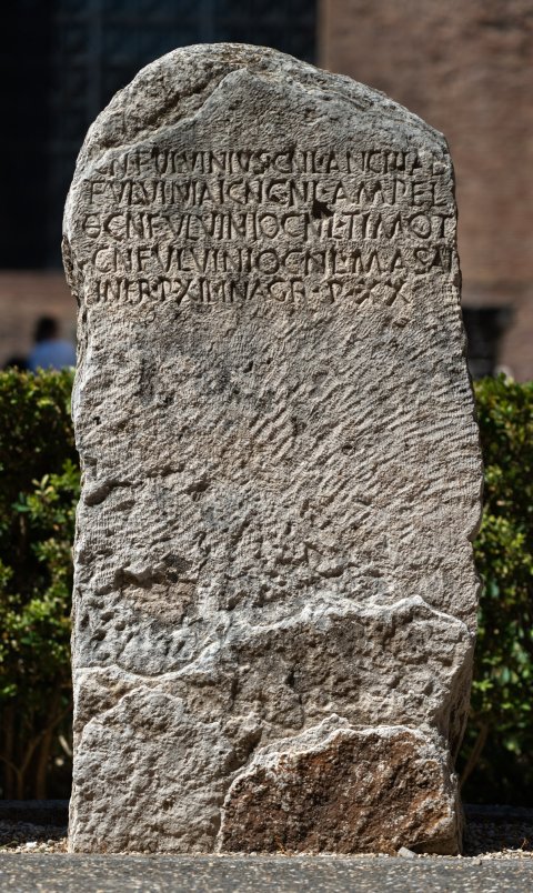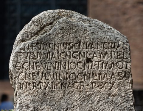 - Cn(aeus) Fulvinius Cn(aei) l(ibertus) Ancial(us) / Fulviniai(!) CnCn(aeorum) l(ibertae) Ampel(idi) / |(obito) Cn(aeo) Fulvinio Cn(aei) l(iberto) Timot(heo) / Cn(aeo) Fulvinio Cn(aei) l(iberto) Masai / in f(ronte) p(edes) XII in agr(o) p(edes) XX