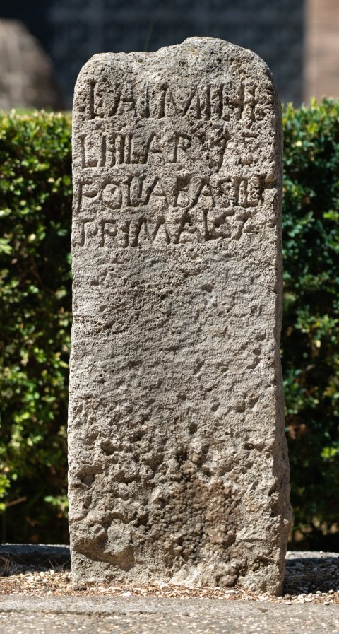 - L(ucius) Aimili(us)! L(uci) / l(ibertus) Hilarus / Folia Basilis / Prima L(uci serva) SA