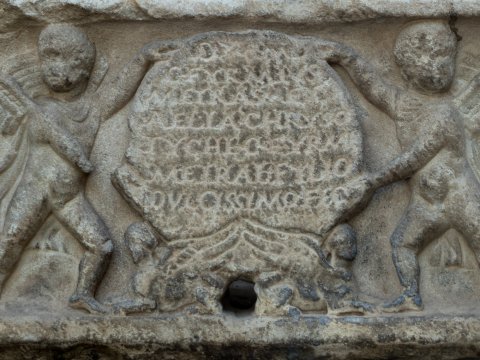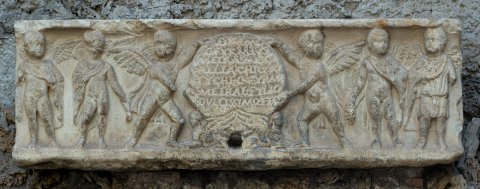 - Auf der Vorderseite runde Schrifttafel, die auf zwei liegenden geflügelten Sphingen steht, gehalten von zwei Eroten; rechts und links von ihnen je zwei weitere Eroten, drei mit Mantel, einer mit kurzer Tunica (Jahreszeiten). Auf den Nebenseiten Greif.