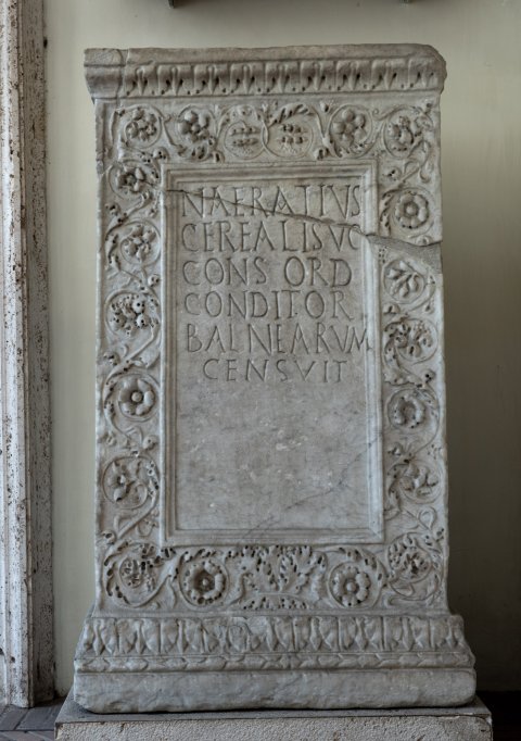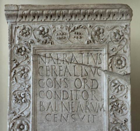 - Naeratius / Cerealis v(ir) c(larissimus) / cons(ul) ord(inarius) / conditor / balnearum / censuit