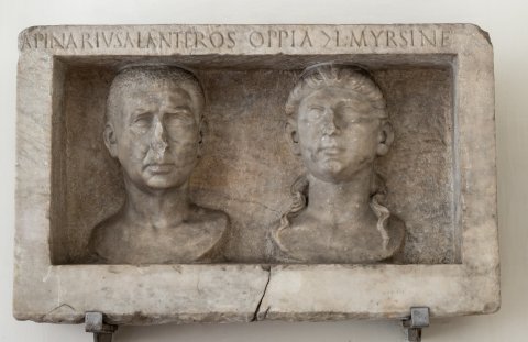 - A(ulus) Pinarius A(uli) l(ibertus) Anteros Oppia |(mulieris) l(iberta) Myrsine