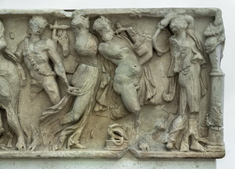 Mythische Figuren, Musikinstrument. Links Dionysos im langen Chiton, von Victorien bekränzt, auf einem Elefantenwagen. Auf den Elefanten sitzen Satyrn. Nach rechts hin Satyrn - einer mit Kleinkind auf dem Arm - und Mänaden mit Lyra und Tympanon, Silen mit Kithara; in der Mitte Altar, an dem eine Mänade ihre Fackel anzündet. Ganz rechts Säule mit Priapusherme. Auf dem Boden Tiere (Panther, Ziege, Ciste mit Schlange).