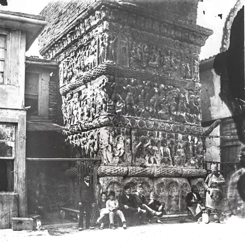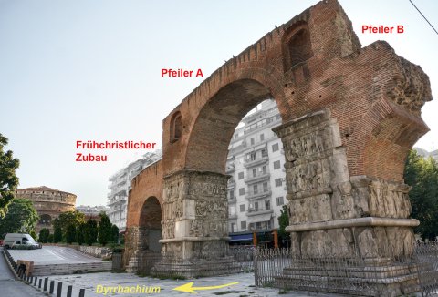 Pfeiler eines Tetrapylon mit einem Kern aus Ziegelmauerwerk, verkleidet mit Marmorreliefs, die Szenen des Perserfeldzugs des Galerius zeigen. Das Tetrapylon markierte die Kreuzung der Via Egnatia mit den Zugängen, die nach NW zur Rotunde, nach SO zum Palast führten.