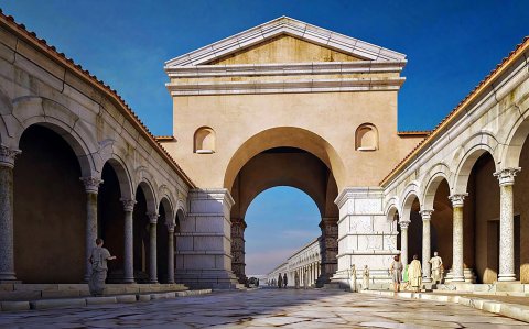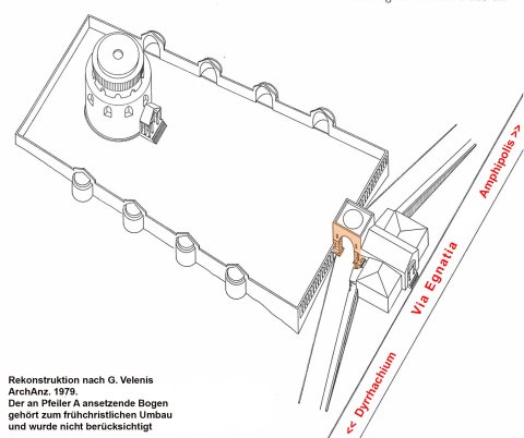 - Vom ursprünglichen Tetrapylon, auf das im spitzen Winkel von der Via Egnatia abzweigende Rampen zuführten, sind noch die 2 Pfeiler erhalten, deren Außenseite in Richtung Dyrrhachium blickt.