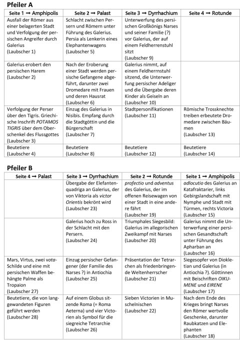 Die Pfeiler tragen auf drei Seiten jeweils vier Reliefszenen; bei Pfeiler A fehlen auf der Seite des später angebauten Bogens (Richtung Rotunde) und bei Pfeiler B auf der Seite des Fußgängerdurchgangs (Richtung Palast) jeweils die zwei oberen Reliefregister.