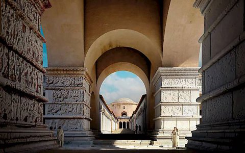 Länge der erhaltenen Reliefplatten insgesamt ca. 112 m = ergänzbare Gesamtlänge der Reliefs aller vier Pfeiler ca. 224 m (Zum Vergleich: Gesamtlänge des Frieses der Trajanssäule 200 m).