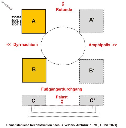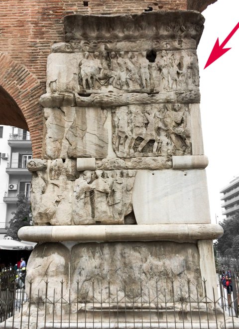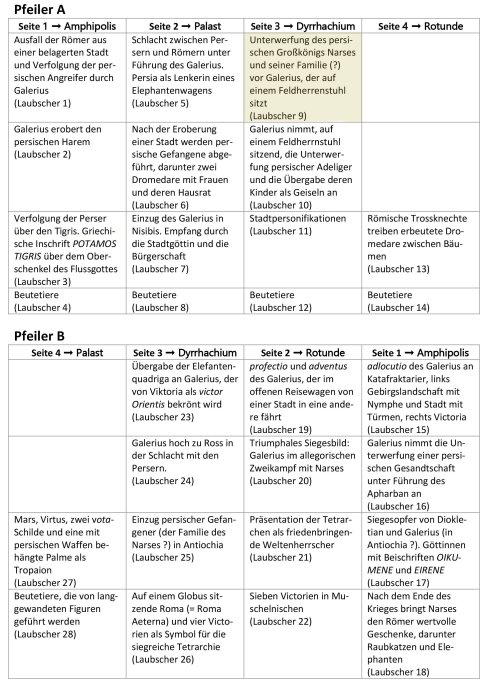 - Pfeiler A, Seite in Richtung Dyrrhachium, oberes Register. Oben vorspringendes Gesims mit Palmettenfries, darunter Perlstab und Rankenfries. Relief: links auf einer sella castrensis thronender Kaiser, umgeben von seiner Leibwache; von rechts herankommende unterworfene Perser, darunter ein Knabe und vier Frauen mit Tiara und Schleier (königliche Familie ?)