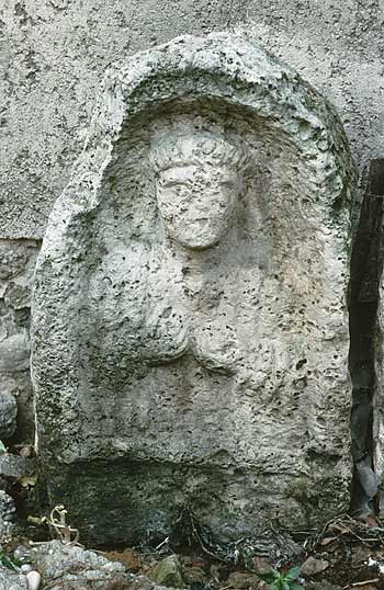 - Im Hauptbild Bogennische mit Brustbild eines Mannes: bartlos, gesträhntes Haar, Umhang, in beiden Händen Frucht. Im Zwischenbild Reiter.
