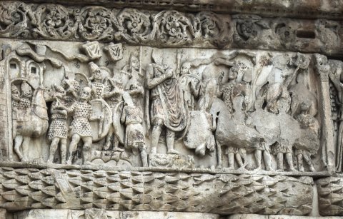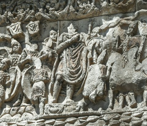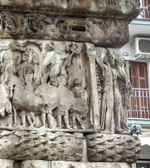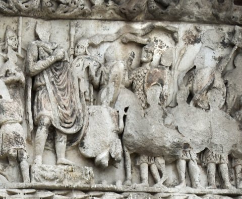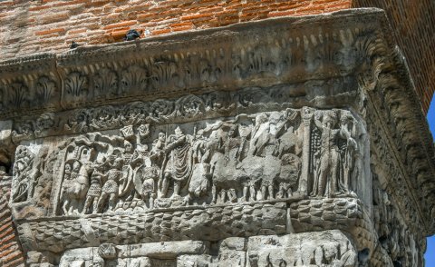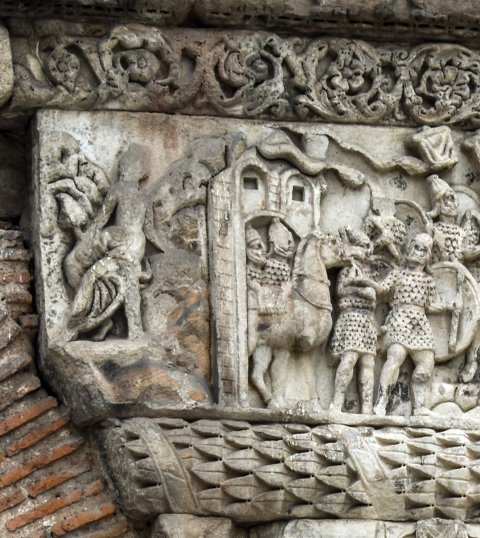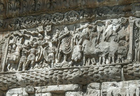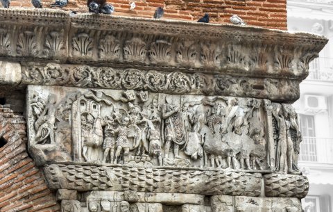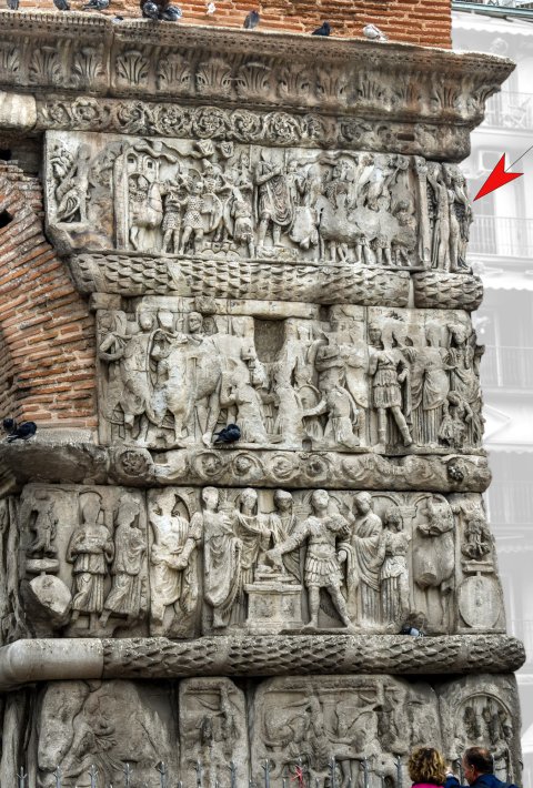 - Pfeiler B, Seite in Richtung Amphipolis, oberstes Register. Oben vorspringendes Gesims mit Palmettenfries, darunter Perlstab und Rankenfries. Relief: Adlocutio. Galerius in der Bildmitte auf Podest stehend, seitlich von ihm Gruppen von Soldaten (Cataphractarii) im Schuppenpanzer, mit Waffen, vexilla und Drachenfahnen. Links Stadttor, aus dem das Pferd des Kaisers herausgeführt wird. Am linken Bildrand Felsenlandschaft mit sitzender Bergnymphe und Schaf. Am rechten Bildrand stehende Victoria mit Füllhorn, von der Adlocutio durch eine Pfeiler mit korinthischem Kapitell getrennt. Unter dem Relief Rundstab mit Lorbeerblättern und Tänien.