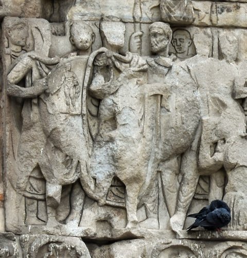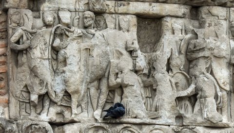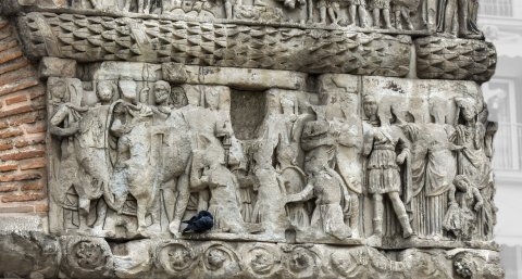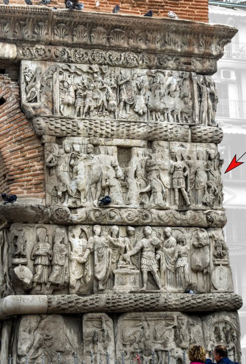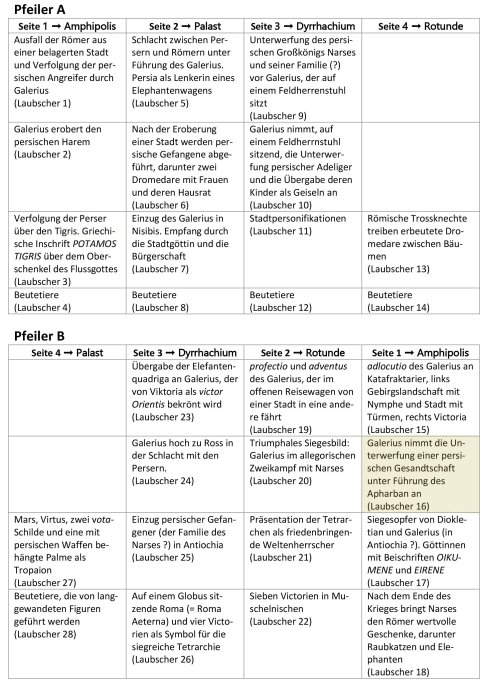 - Pfeiler B, Seite in Richtung Amphipolis, 2. Register von oben. Relief: Der links zwischen Soldaten stehende Galerius empfängt in Nisibis fünf vor ihm kniende persische Gesandte. Rechts stehen Dea Roma und vier Stadtpersonifikationen, zu ihren Füßen sitzt die trauernde Persia, an die sich ein Knabe anschmiegt.