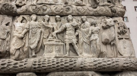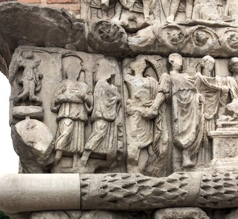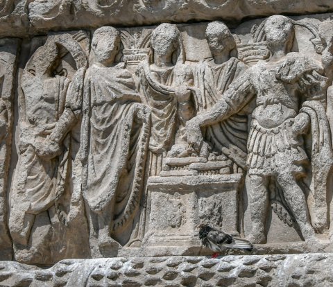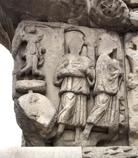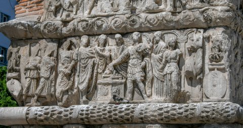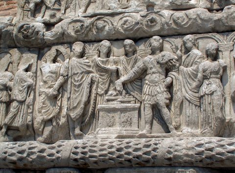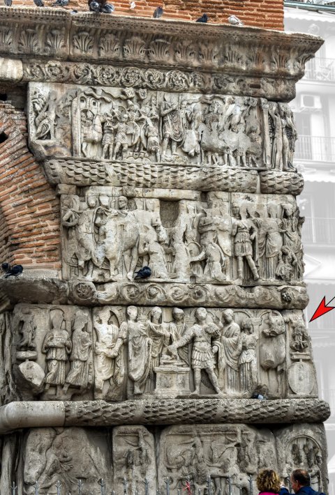 - Pfeiler B, Seite in Richtung Amphipolis, 3. Register von oben. Relief: Opferszene. Vor einer Arkadenarchitektur opfern Galerius in Feldherrntracht und Diocletian in Ärmeltunica und Mantel mit Fransensaum an einem Altar, auf dessen Seiten Reliefs des thronenden Jupiter und Hercules zu sehen sind. Hinter dem Altar zwei weibliche Personifikationen, eine mit Beischrift Oikumene. An Galerius' linker Seite steht die Personifikation der Eirene, neben dieser kleinere weibliche Figur, die einen Opferstier am Strick führt. Hinter Diocletian steht eine männliche Figur mit Zodiacus um Kopf und Schultern (Aion ?), dann folgen zwei Opferdiener, der hintere mit Kästchen. Die Szene wird seitlich von breiten Pilastern gerahmt, vor denen jeweils ein Rundschild und eine Victoriastatuette auf einer Stange aufgestellt sind.