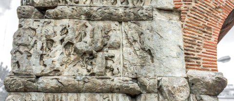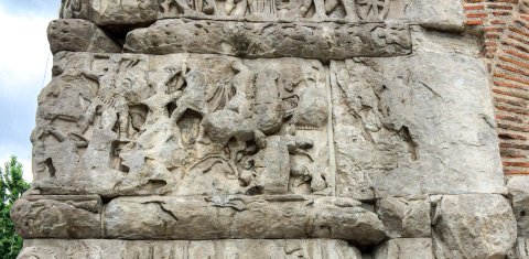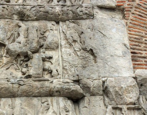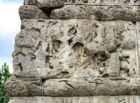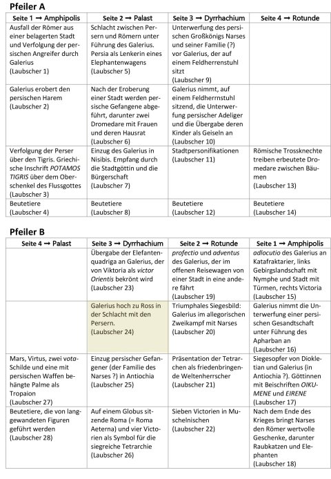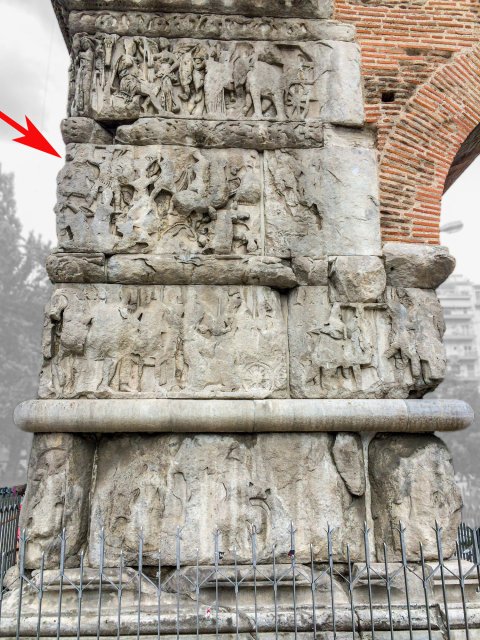 - Pfeiler B, Seite in Richtung Dyrrhachium, 2. Register von oben. Im Rundstab mit Lorbeerblättern und Tänien, der das Relief oben begrenzt, erscheint in der Mitte über dem Kopf des Galerius ein Adler mit Kranz. Oben angreifende Römer, angeführt von Galerius zu Pferd, die besiegten Perser liegen oder knien den Römern zu Füßen.