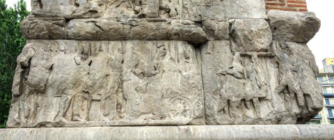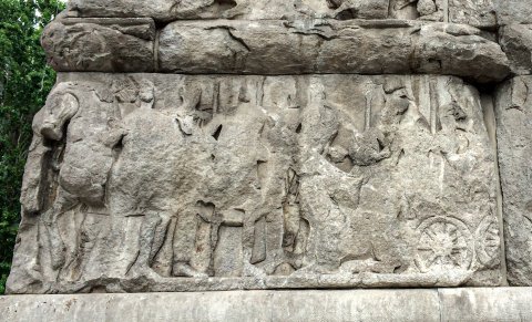- Pfeiler B, Seite in Richtung Dyrrhachium, 3. Register von oben. Von rechts nach links ziehende römische Fußsoldaten, die einen Ochsenkarren begleiten, auf dem zwei Frauen sitzen und dem zwei Perser folgen. Einer der Zugochsen hat sich bereits niedergelegt. Links am Anfang des Zuges und rechts am Ende hält jeweils ein Römer ein Pferd am Zügel. Triumphzug mit der gefangenen Familie des Perserkönigs ?