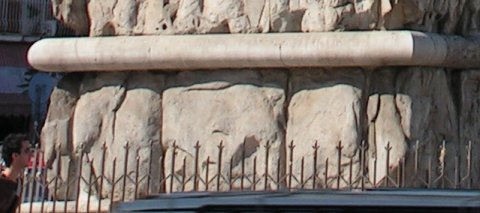 - Pfeiler B, Seite in Richtung Palast, unteres Register. Umrisse von nach rechts gehenden Rindern, rechts Spuren einer langewandeten Gestalt.