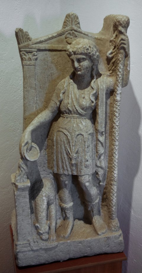 - Mythische Figur: Stele mit Giebel mit Akroteren, im Giebelfeld Rosette, seitlich Pilaster, unten Standleiste. Hochrelief des jugendlichen Dionysos (Liber Pater) mit Schulterlocken, kurzem Chiton und darüber gegürteter Nebris, hohen geschnürten Schuhen, Mantel über der linken Schulter; die rechte Hand gießt eine Schale über einem brennenden Altar aus, die erhobene Linke hält den Thyrsosstab. Neben dem rechten Bein Panther.