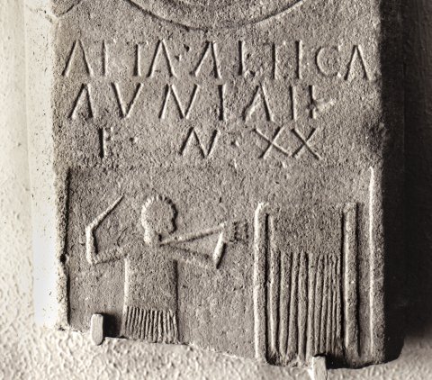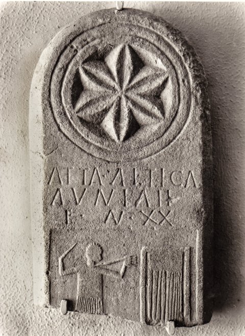 - Stele mit Bogenabschluss. Über der Inschrift Kreisrosette, unter der Inschrift eingetieftes Relieffeld; stehende Frau neben Webstuhl.