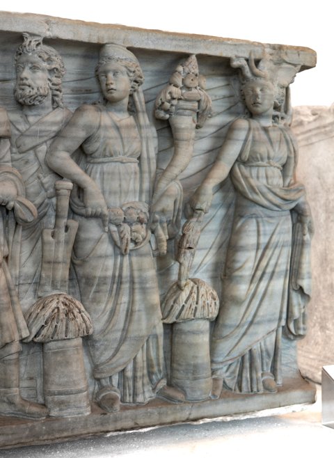 Seitlich je zwei weibliche Personifikationen: rechts Annona mit Füllhorn und Steuerruder, zu ihren Füßen zwei Körbe mit Ähren; ganz rechts Africa mit Elefantenhaube und Ähren in der rechten Hand. Links die beiden Hafenstädte, Ostia mit mit Mauerkrone, Steuerruder und Schreibtafel und Portus mit Leuchtturm auf dem rechten Arm.