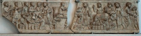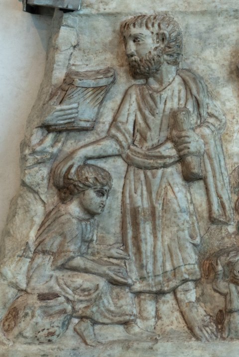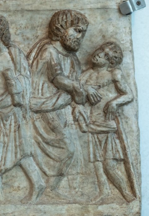 Zwei Relieffelder übereinander. Im oberen Feld links Füße von stehenden Personen; rechts Felsgrund mit liegendem Schaft, ein kniender und drei auf dem Boden sitzende Hirten, die nach oben schauen. Anschließend drei stehende männliche Figuren, die linke mit volumen in der Hand wendet sich den beiden anderen zu.