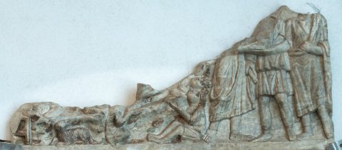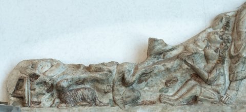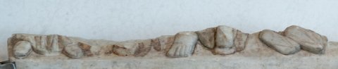 - 2 anpassende Fragmente der Vorderwand eines Sarkophages, oben u. seitlich abgebr.
