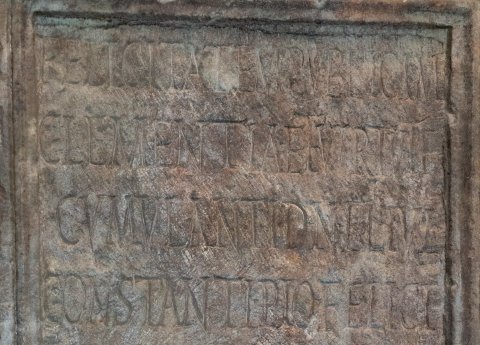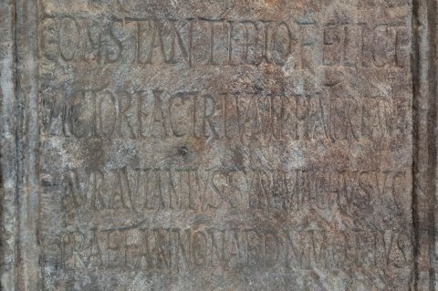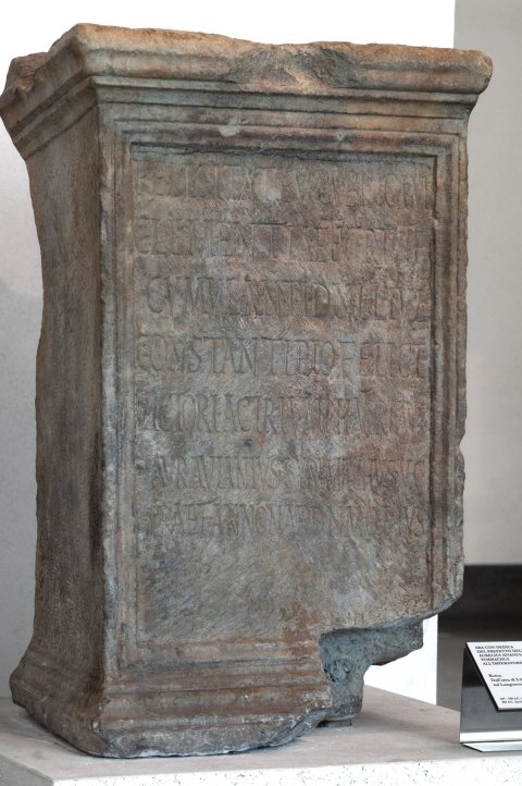 - Felicitatem publicam / clementia et virtute / cumulanti d(omino) n(ostro) Fl(avio) Iul(io) / Co(n)stanti Pio Felici / victori ac triumphatori Aug(usto) / Aurelius Avianius Symmachus v(ir) c(larissimus) / praef(ectus) annonae d(evotus) n(umini) m(aiestati)q(ue) eius // Dedicata / VI Kal(endas) Iun(ias) dd(ominis) nn(ostris) / Carino Aug(usto) et / Numiriano(!) Aug(usto) / co(n)ss(ulibus)