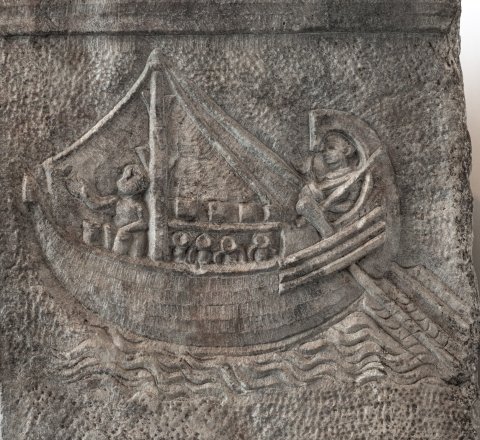 - auf der rechten Nebenseite oben flaches Relief mit Darstellung eines mit Amphoren beladenen Segelschiffes