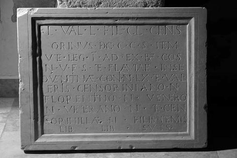- L(ucius) Val(erius) L(ucii) fil(ius) Cl(audia) Cens/orinus dec(urio) c(oloniae) C(laudiae) S(avariae) item / vet(eranus) leg(ionis) I ad(iutricis) ex b(ene)f(iciario) co(n)s(ularis) an(norum) v(ivus) f(ecit) s(ibi) et Flaviae Inse/quentinae coni(ugi) an(norum) LX et Val/eri(i)s Censoriniano an(norum) / Florentino an(norum) Venerio / an(norum) Veterano an(norum) et Cen/sorinillae an(norum) fili(i)s itemq(ue) / lib(ertis) libertab(us) suis