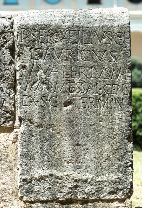 - P(ublius) Serveilius C(ai) f(ilius) / Isauricus / M(arcus) Valerius M(arci) E(ilius)! / Ma(ni) n(epos) Messal(la) cens(ores) / ex s(enatus) c(onsulto) termin(arunt)