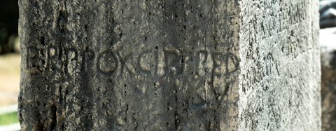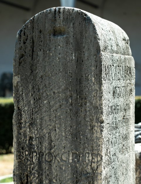 - Imp(erator) Caesar divi f(ilius) / Augustus / pontifex maximus / tribunic(ia) potest(ate) XVII / ex s(enatus) c(onsulto) terminavit / r(ecta) r(egione) prox(imus) cipp(us) ped(es) CXLVIII s(emis) // r(ecta) r(egione) prox(imus) cipp(us) ped(es) / XV