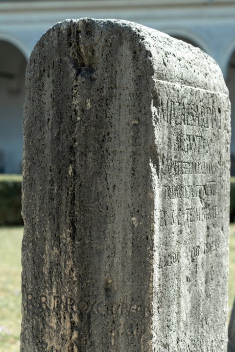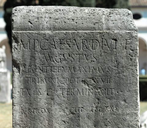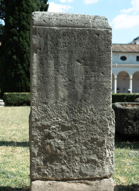 - Imp(erator) Caesar divi f(ilius) / Augustus / pontifex maximus / tribunic(ia) potest(ate) XVII / ex s(enatus) c(onsulto) terminavit r(ecta) r(egione) prox(imus) cipp(us) ped(es) XX s(emis) // r(ecta) r(egione) prox(imus) cipp(us) ped(es) XXV // r(ecto) r(igore) prox(imus) c(ippus) [---]