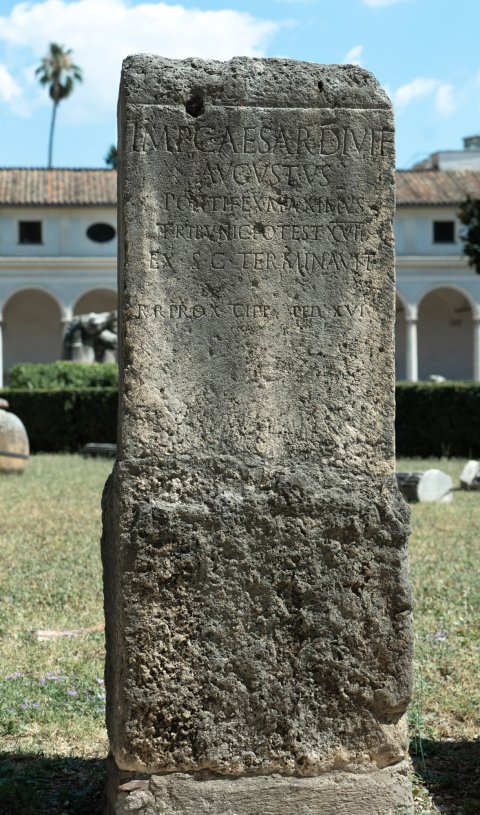 - Imp(erator) Caesar divi f(ilius) / Augustus / pontifex maximus / tribunic(ia) potest(ate) XVII / ex s(enatus) c(onsulto) terminavit r(ecta) r(egione) prox(imus) cipp(us) ped(es) XVI // r(ecta) r(egione) prox(imus) cipp(us) ped(es) XLI