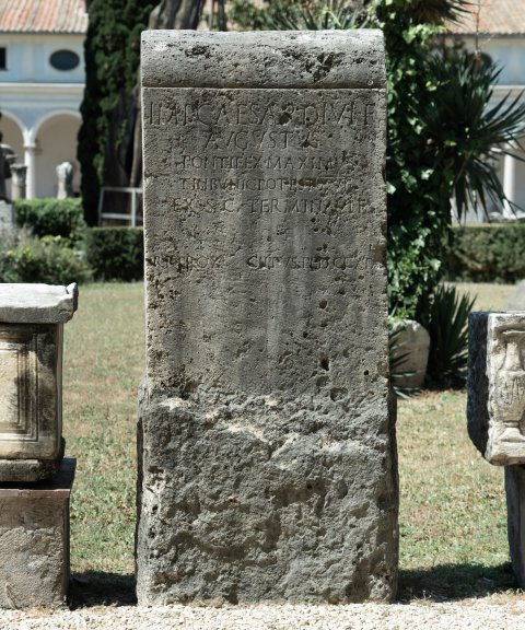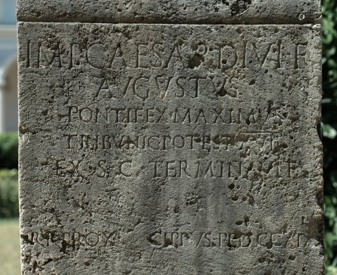 - Imp(erator) Caesar divi f(ilius) / Augustus / pontifex maximus / tribunic(ia) potest(ate) XVII / ex s(enatus) c(onsulto) terminavit r(ecta) r(egione) prox(imus) cippus ped(es) CCXIX