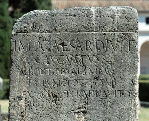 - Imp(erator) Caesar divi f(ilius) / Augustus / pontifex maximus / tribunic(ia) potest(ate) XVII / ex s(enatus) c(onsulto) terminavit // r(ecta) r(egione) prox(imus) cipp(us) ped(es) XX s(emis) // r(ecta) r(egione) prox(imus) cipp(us) p(edes) XV s(emis)