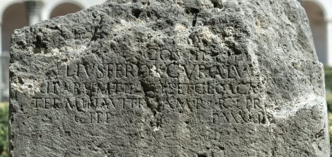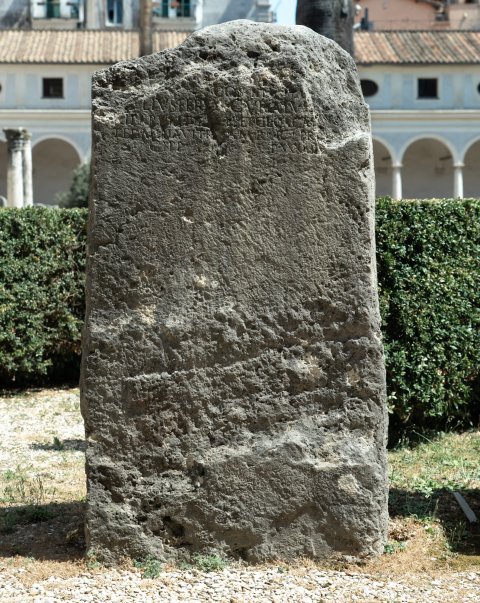 - [Ex auctoritate] / [Imp(eratoris) Caesaris divi] / [Nervae fil(ii) Nervae Traiani] / [Germanici p]onti[ficis max(imi)] / [trib(unicia) pot(estate) V] co(n)s(ulis) IIII p(atris) [p(atriae)] / [Ti(berius) I]ulius Ferox cur(ator) alve[i et] / riparum Tiberis et cloacar(um) / terminavit r[i]pam r(ecta) r(egione) pro[x(imo)] / cipp(o) p(edes) XXXXIIII