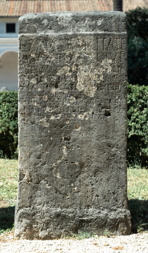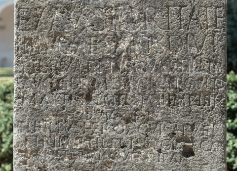 - Ex actoritate / Imp(eratoris) Caesaris divi / Nervae fil(ii) Nervae Traian(i) / Aug(usti) Germ(anici) Dacici pont(ificis) / max(imi) trib(unicia) potest(ate) VII imp(eratoris) IIII / co(n)s(ulis) V p(atris) p(atriae) / Ti(berius) Iulius Ferox cur(ator) alvei / et ripar(um) Tiberis et cloacar(um) / urbis terminavit ripam