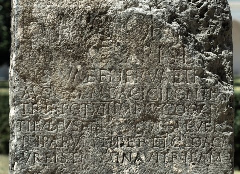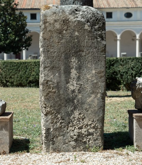 - Ex auctori[tate] / Imp(eratoris) Caesaris d[ivi] / Nervae f(ilii) Nervae Tra[iani] / Aug(usti) Germ(anici) Dacic(i) pont(ificis) m[ax(imi)] / trib(unicia) pot(estate) VII imp(eratoris) IIII co(n)s(ulis) V p(atris) p(atriae) / Ti(berius) Iulius Ferox cur(ator) alvei e[t] / riparum Tiber(is) et cloaca[r(um)] / urbis terminavit ripam