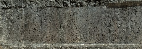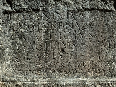 - L(ucius) Caninius Gallus / L(ucius) Volusenus Catulus f(ilius) / C(aius) Caecidius Agrippa / M(arcus) Acilius Memmius Glabrio / Q(uintus) Fabius Balbus / curatores riparum et alvei Tiberis ex s(enatus) c(onsulto) / reficiundam curaver(unt) idemque probaverunt