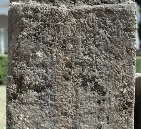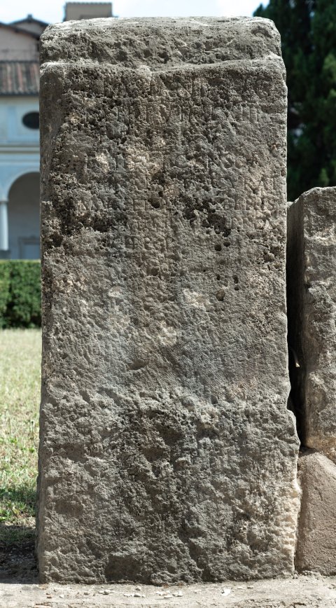 - [Ex auctoritate] / [Imp(eratoris) Caesaris] / Vespasiani Aug(usti) / p(ontificis) m(aximi) tr(ibunicia) p(otestate) V imp(eratoris) XIII / p(atris) p(atriae) co(n)s(ulis) V / desig(nati) VI censor(is) / [C(aius)] Caecina Paetus curat(or) / riparum et alvei Tiberis / [termin]avit rip(am) Veie[nt(anam)] prox(imam) / cipp(is) p(ositis)