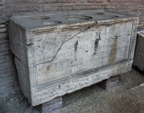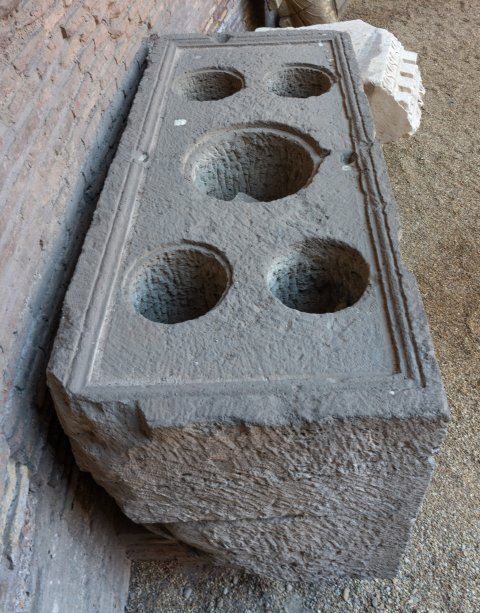 - Block mit gerahmtem, vertikal in drei Kolumnen geteiltem Schriftfeld; auf der gerahmten Oberseite runde Aushöhlungen für fünf Aschenurnen.