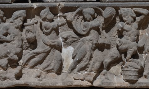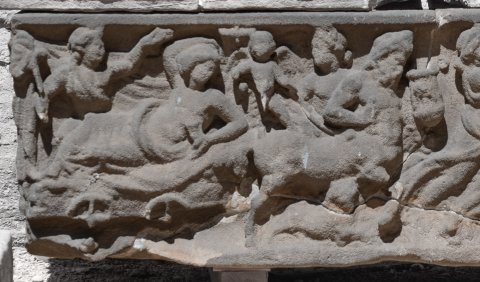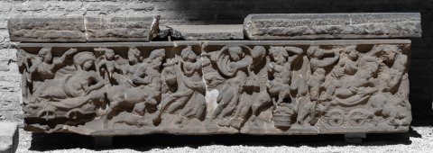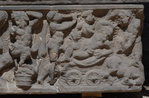 - Thiasos. Links Dionysos auf von Kentauren gezogenen Wagen gelagert, in der Mitte tanzende Mänaden, Pan, Flöte spielender Satyr; rechts Wagen mit liegendem Silen und zusammengebrochenem Maultier.