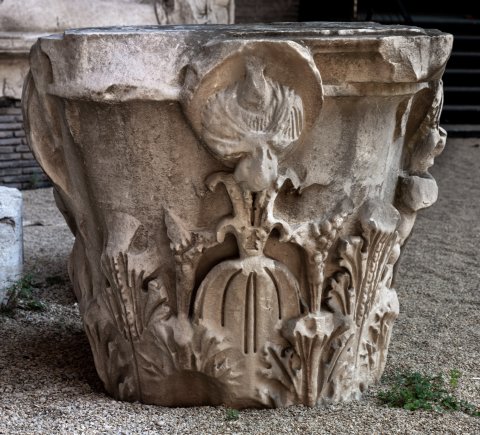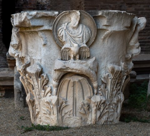 Korinthisches Kapitell, an vier Seiten Tondi mit Porträtbüsten (imago clipeata) des Kaisers Antoninus Pius und der Faustina maior. Die zwei Kaiserbüsten werden von einem Adler, die zwei der Kaiserin von einem Pfau getragen.