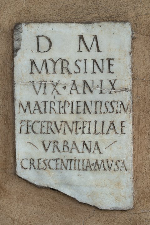 - D(is) M(anibus) / Myrsin(a)e / vix(it) an(nos) LX / matri pientissim(ae) / fecerunt filiae / Urbana / Crescentilla Musa